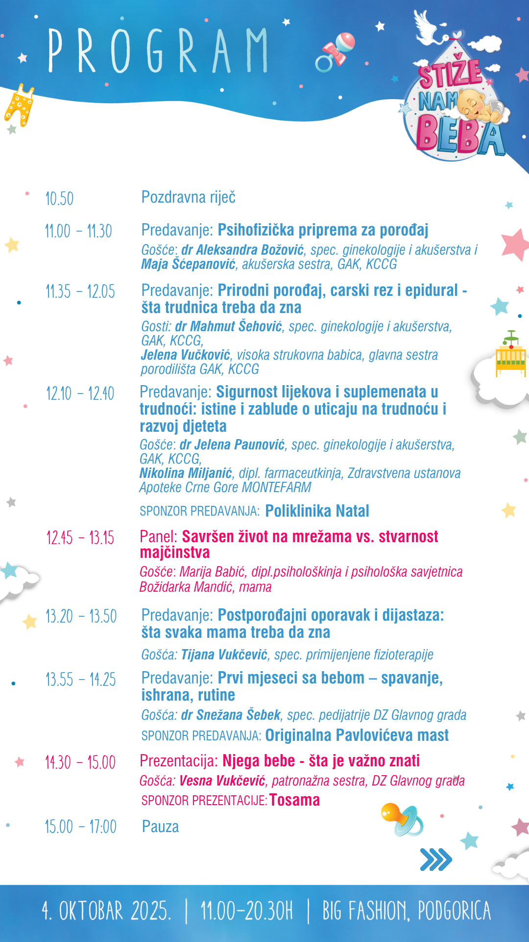 Program će i ovog puta obuhvatiti najbitnije teme koje interesuju sve one koji se pripremaju za dolazak bebe. Među temama su: psihofizička priprema za porođaj, sigurnost ljekova i suplemenata u trudnoći, prvi mjeseci sa bebom, njega bebe, najčešći izazovi u dojenju i kako ih prevazići, njega kože bebe, prikaz savršenog života na mrežama naspram stvarnih izazova majčinstva i roditeljstva i druge.