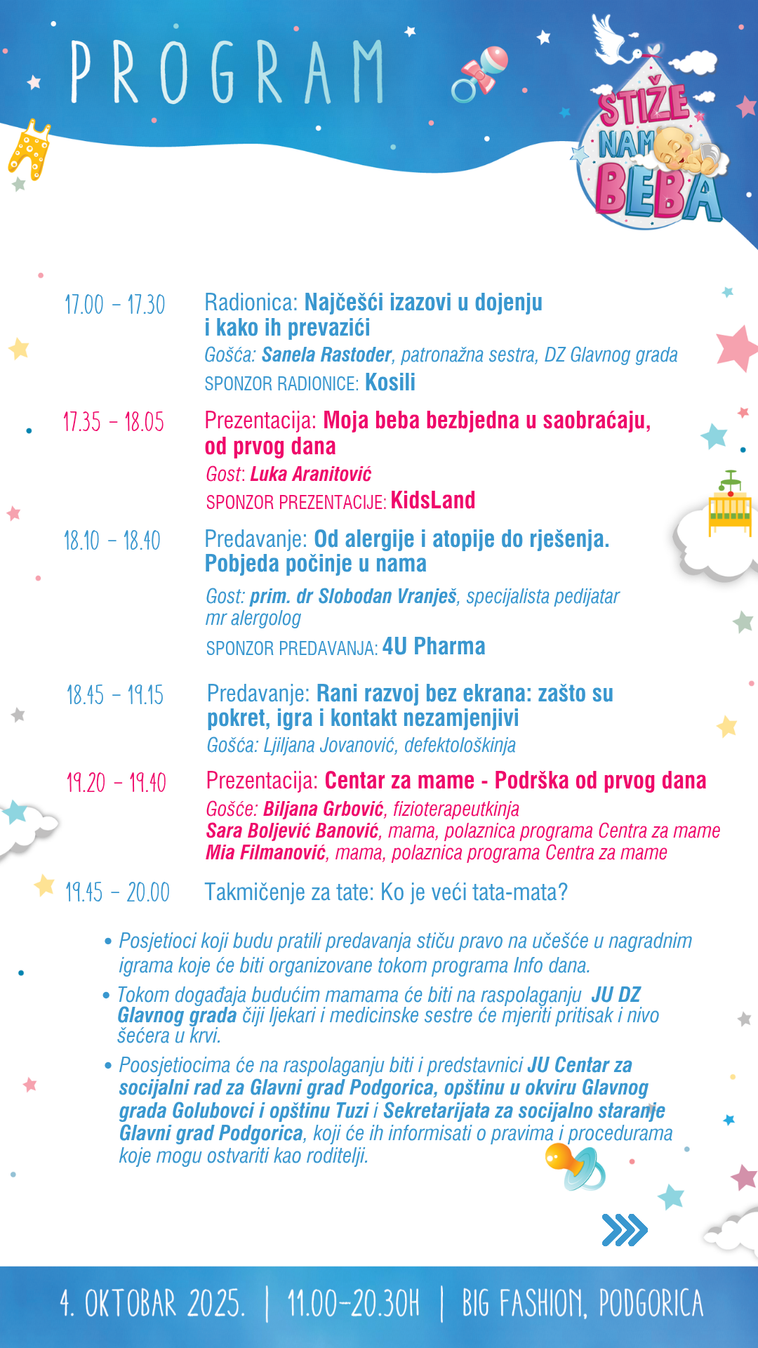 Info dan Stiže nam beba je događaj koji već godinama okuplja buduće roditelje i one koji su to nedavno postali, pružajući im priliku da se informišu, edukuju, ali i osvoje poklone koji će im biti korisni tokom prvih mjeseci sa bebom.