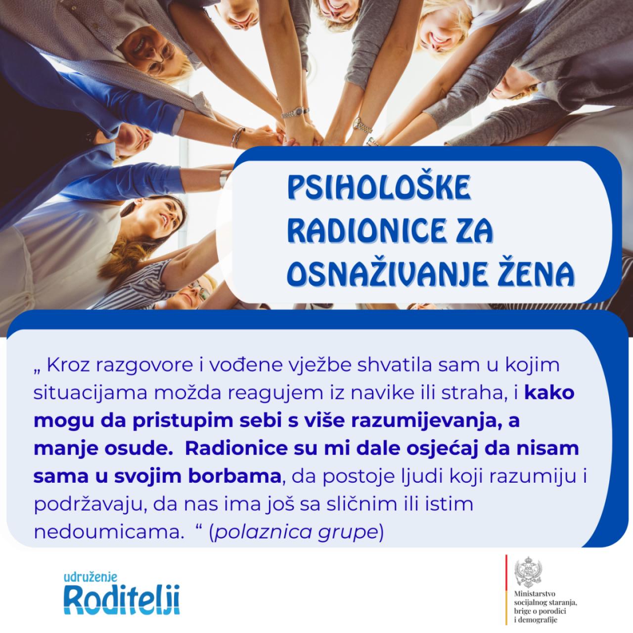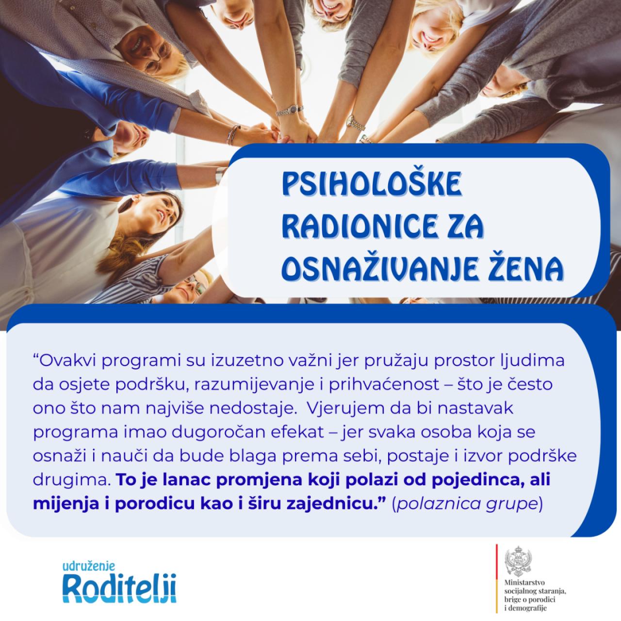 Udruženje Roditelji je, u partnerstvu sa Ministarstvom socijalnog staranja, brige o porodici i demografije, tokom protekle godine realizovalo projekat „Osnaživanje žena i djece žrtava nasilja”, kroz koji je porodicama pružena raznovrsna podrška – psihološke seanse, pravne konsultacije i edukativni programi. Posebno značajan segment projekta bile su psihološke radionice osnaživanja žena, koje su se održavale jednom sedmično, u kontinuitetu od sedam mjeseci.
