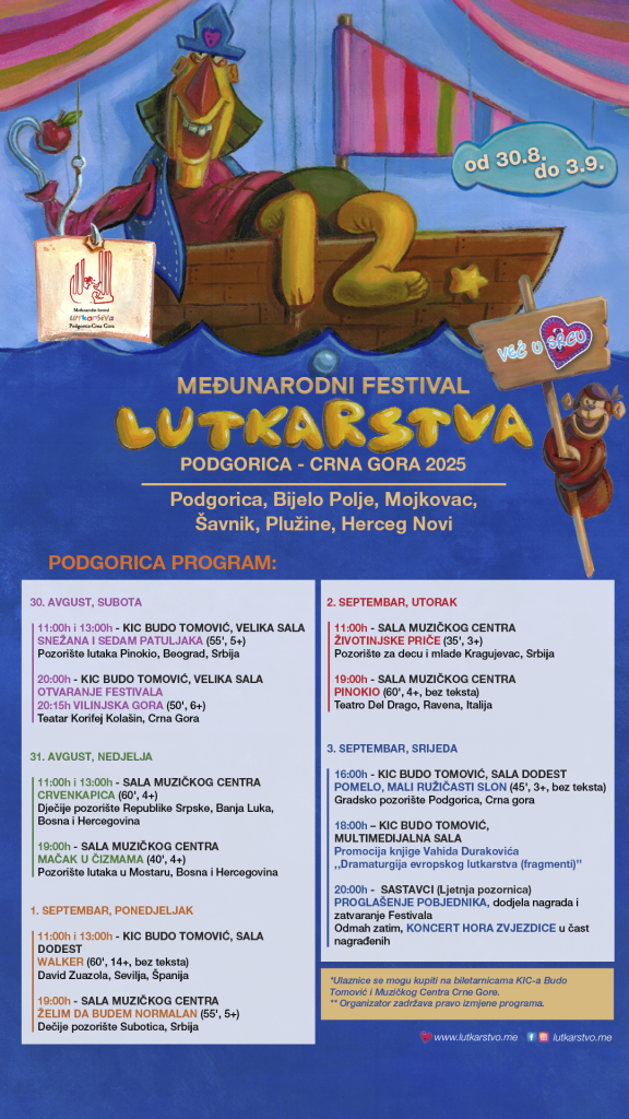 Dvanaesto izdanje Međunarodnog festivala lutkarstva Podgorica – Crna Gora 2025. počinje sjutra. Festival se organizuje u okviru Podgoričkog kulturnog ljeta i trajaće do 3. septembra, a ove godine učestvuje devet pozorišta iz pet zemalja: Španije, Srbije, Bosne i Hercegovine, Italije i Crne Gore. Osim u Podgorici, festival se održava u još pet gradova – Bijelom Polju, Šavniku, Mojkovcu, Plužinama i Herceg Novom.